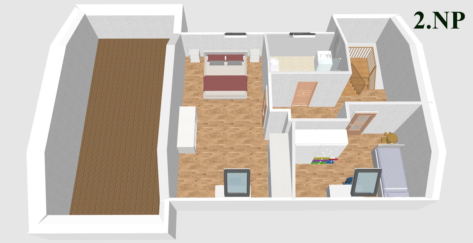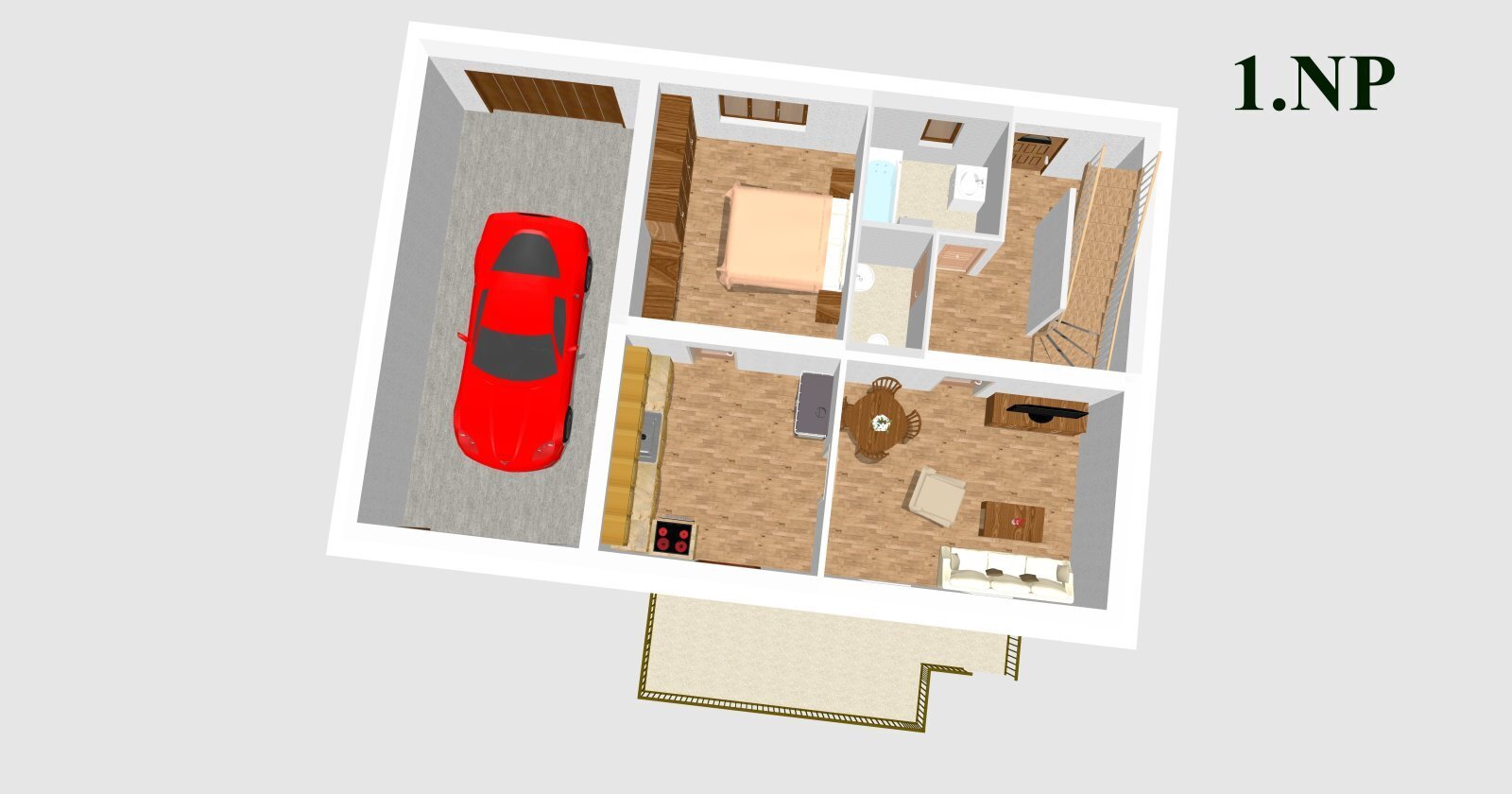 Toto podlaží lze snadno upravit na samostatnou bytovou jednotku o dispozici 2+kk, případně 3+kk při využití půdního prostoru, což z domu činí ideální řešení pro vícegenerační bydlení nebo kombinaci vlastního bydlení a pronájmu.