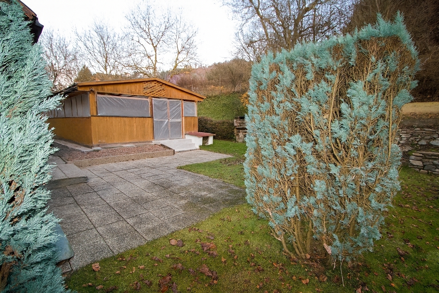 Na pozemku se nachází samostatná budova s letní kuchyní a dílnou a dřevěná kůlna. Součástí prodeje je také garáž a zastřešený bazén, který nabízí komfortní využití během teplých měsíců.